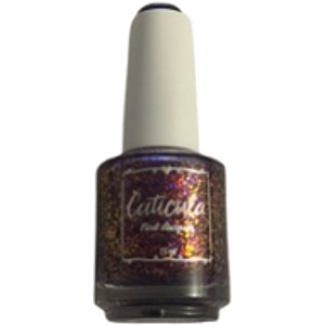 A deep purple base with orange/gold, purple/blue shifting glass flakes, and black flakes.