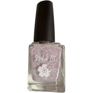 A white crelly base with red and purple metallic flakes.