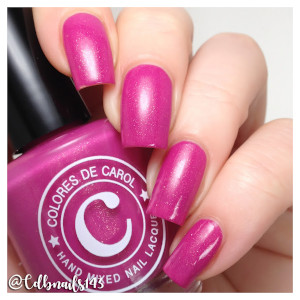 A fuchsia pink base with multi chrome shimmer (gold/green/purple), gold dust shimmer and micro holo glitter.