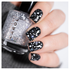 A clear base with matte white glitter in various shapes and sizes and silver holographic mini snowflakes.